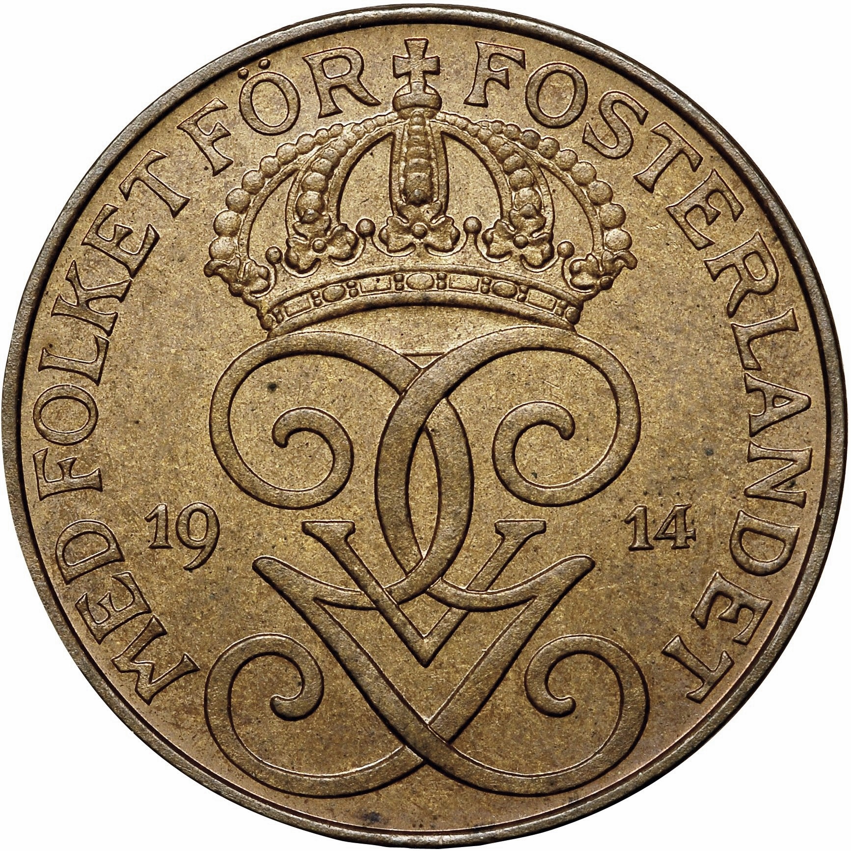 Опис: Коронований подвійний монограм короля Густава V Швеції розділяє дату та девіз короля по краю монети.