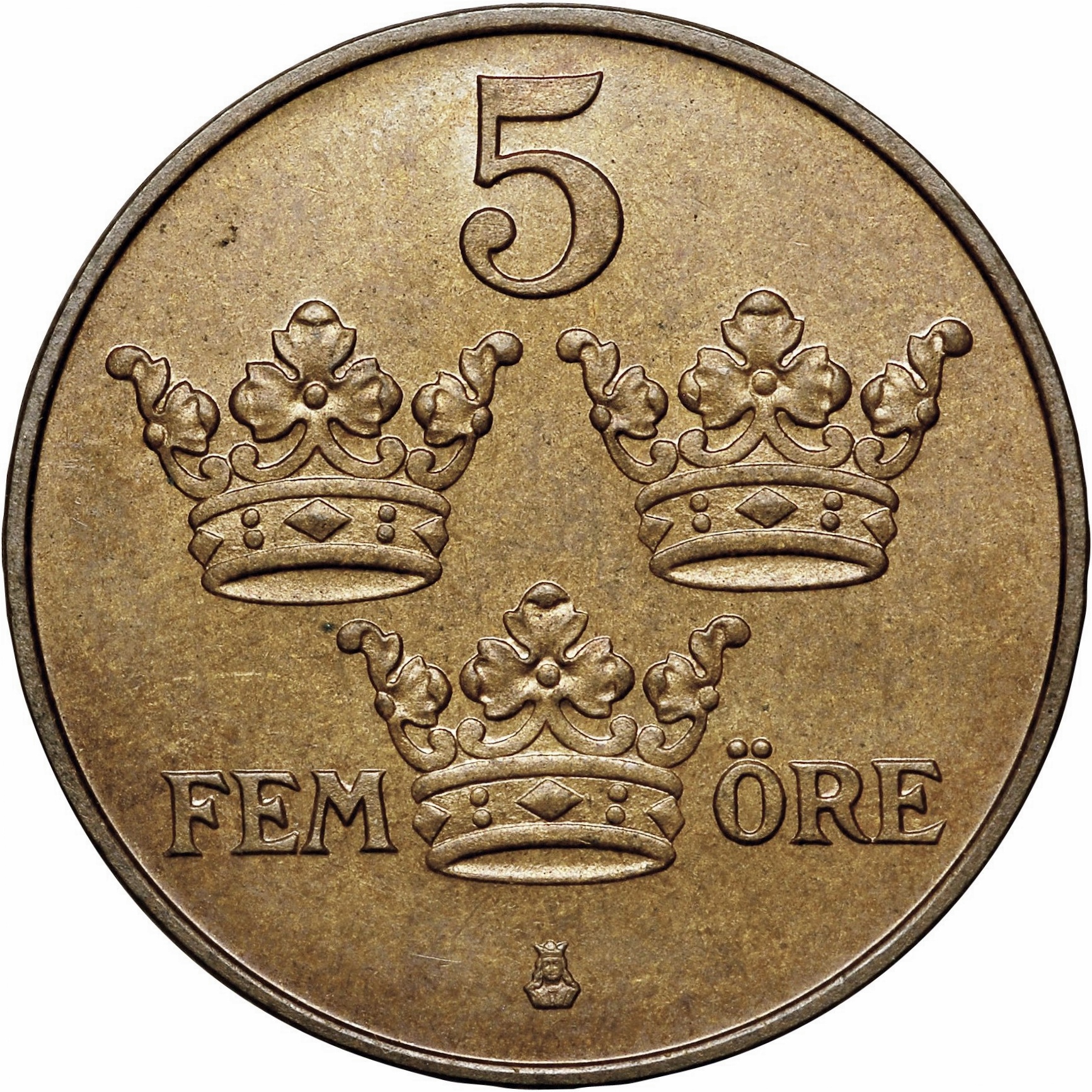 Опис: Три корони Швеції розділяють номінал літерами в основі нижньої корони з номіналом у цифрах і нижче знаком монетного двору Стокгольма вище.