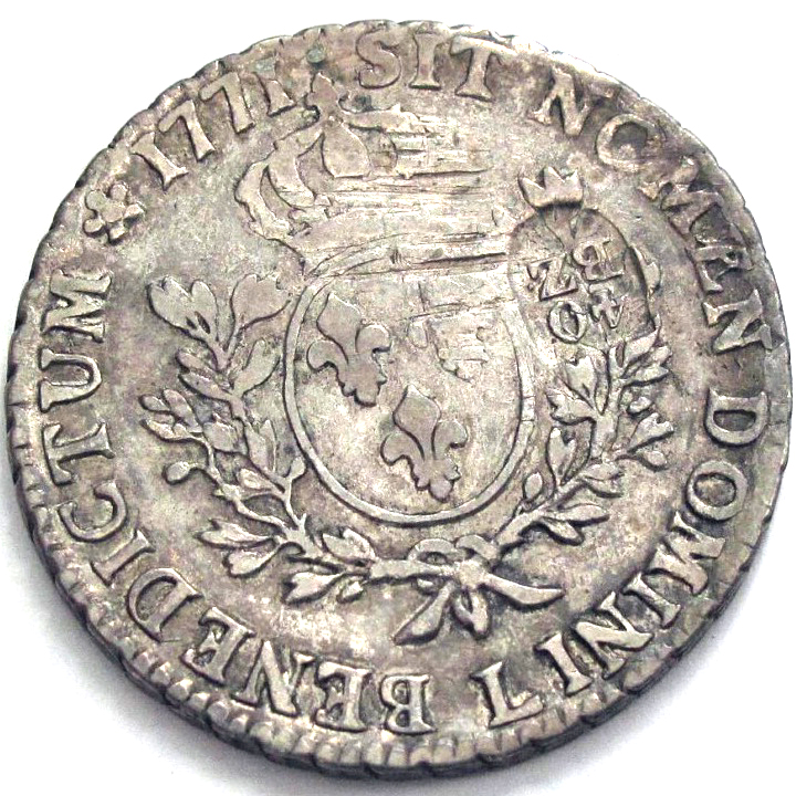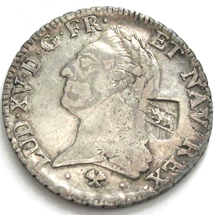 Опис: Контрастempel на французькій монеті Louis XV Écu, KM#551. ПРИМІТКА: можуть існувати різновиди, що стосуються знаків монетного двору. Будь ласка, використовуйте функцію «Особисті коментарі», щоб позначити їх.