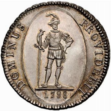Опис: У виїмці овальної форми зображений солдат у повній збройній екіпіровці, в капелюсі з пір'ям, який тримає меч у правій руці, спрямованій до землі, а ліву руку поклав на стегно. Латинські написи зліва і справа.