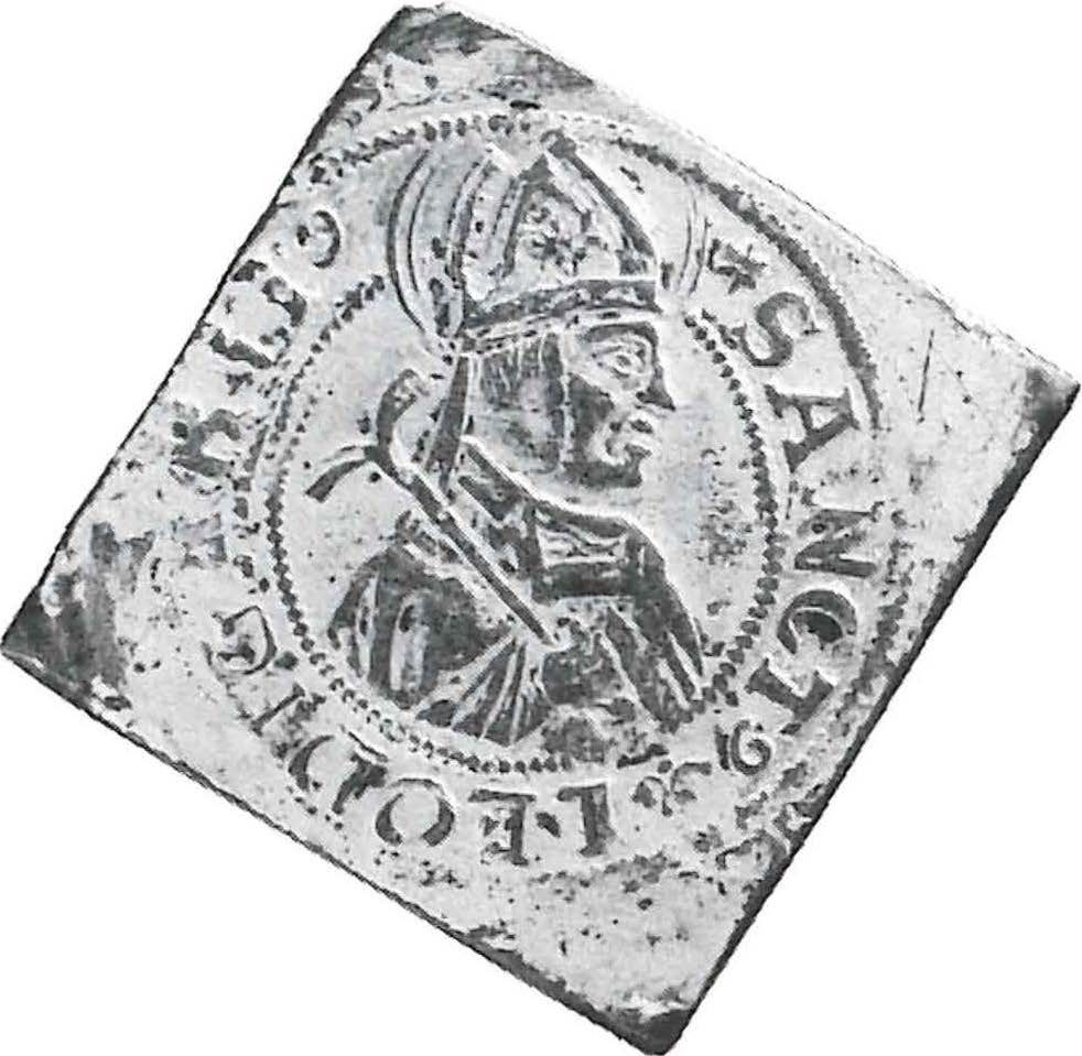 Опис: Бюст святого Леодегара, звернений вправо, з німбом, в регаліях, в вишитій митрі, з ручним дрилем на правому плечі. Шрифт Antiqua.
