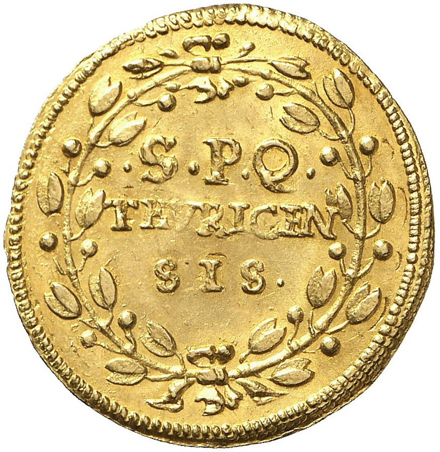 Опис: На лицьовій стороні зображено повну фігуру імператора Карла Великого в мантії та короні, який сидить і тримає меч на колінах. Полілоб всередині квадролобу всередині кола навколо.