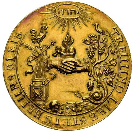 Опис: У верхній частині — сяючий овальний картуш з ім'ям Бога на івриті. Нижче — дві з'єднані руки з палаючим серцем, пов'язаним стрічкою ззаду. Зліва — обеліск з півнем. Справа — виноградна лоза з голубкою. У нижній частині — череп.