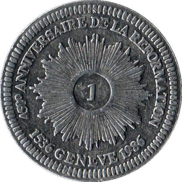 1 пістоль — 450-та річниця Реформації (Женева) 1986 – 1986 Швейцарія