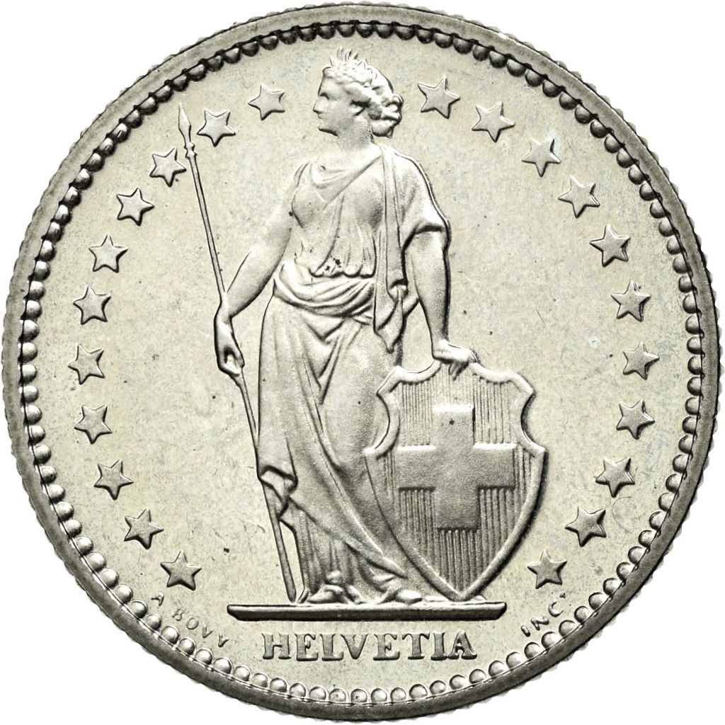 Опис: Повна фігура Гельвеції, що стоїть, обернена вліво, одягнена в тогу, тримає спис у правій руці, а лівою рукою підтримує щит з гербом Швейцарії. Навколо 22 зірки, що символізують 22 кантони Швейцарської конфедерації. У 1983 році була додана 23-тя зірка для кантону Юра, який був заснований у 1979 році.