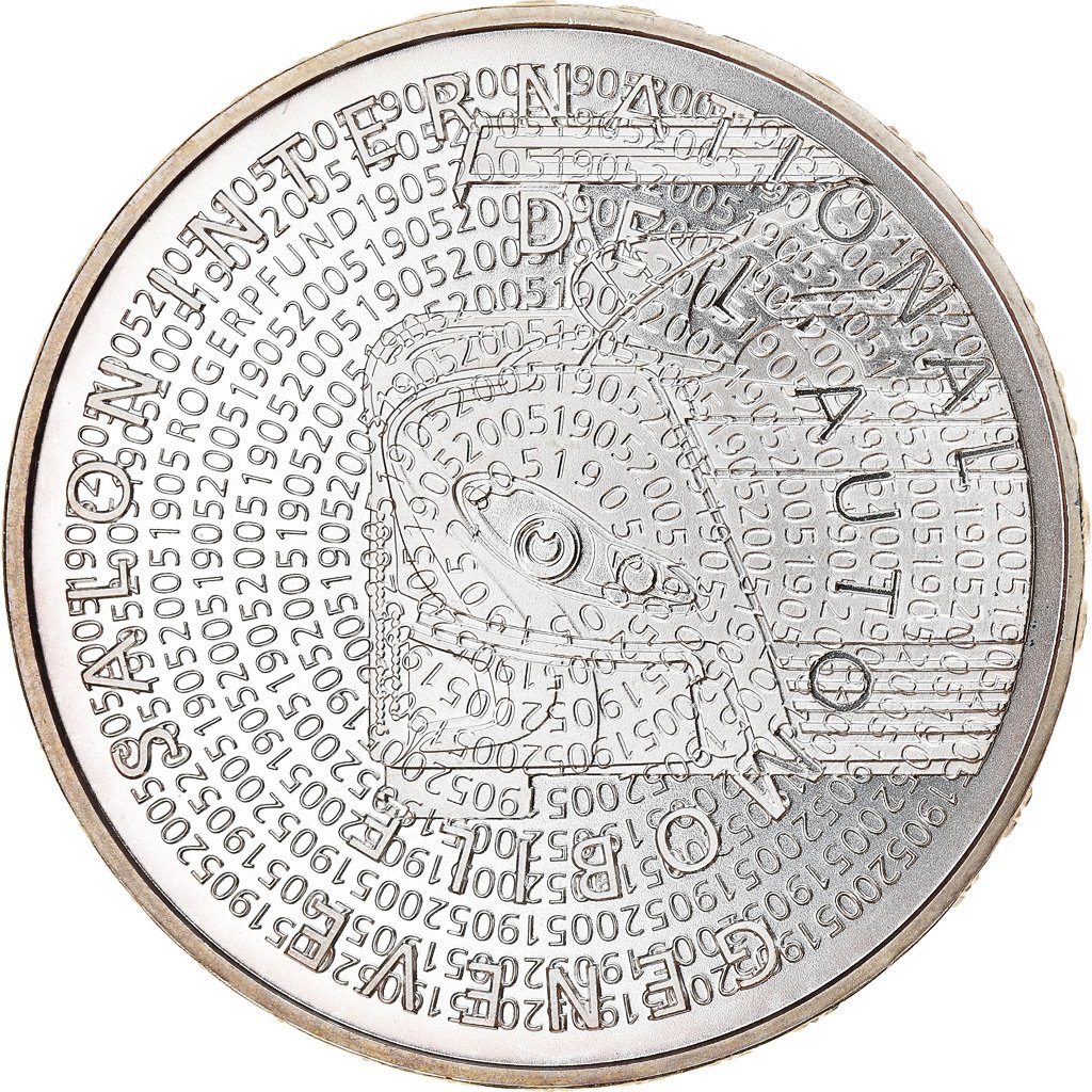 Опис: Частковий вид спереду сучасного гоночного автомобіля. «19052005» повторюється у концентричних колах, накладених на всю поверхню монети. Ім'я гравера вгорі ліворуч.