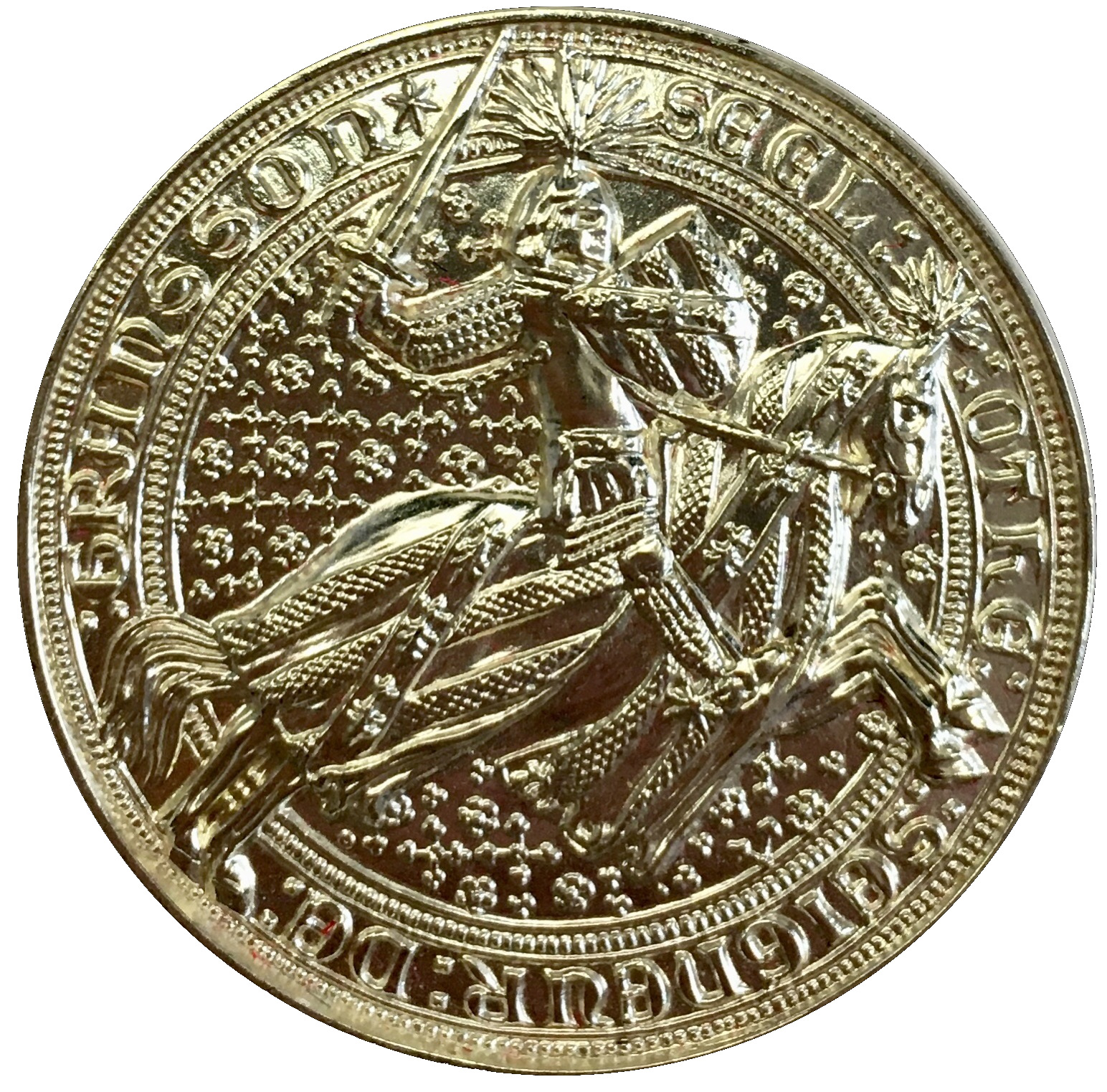 Опис: Репліка печатки лорда Отона з Грандсона: лицар на коні, що галопує, розмахуючи мечем і несучи щит з гербом родини Грандсон.