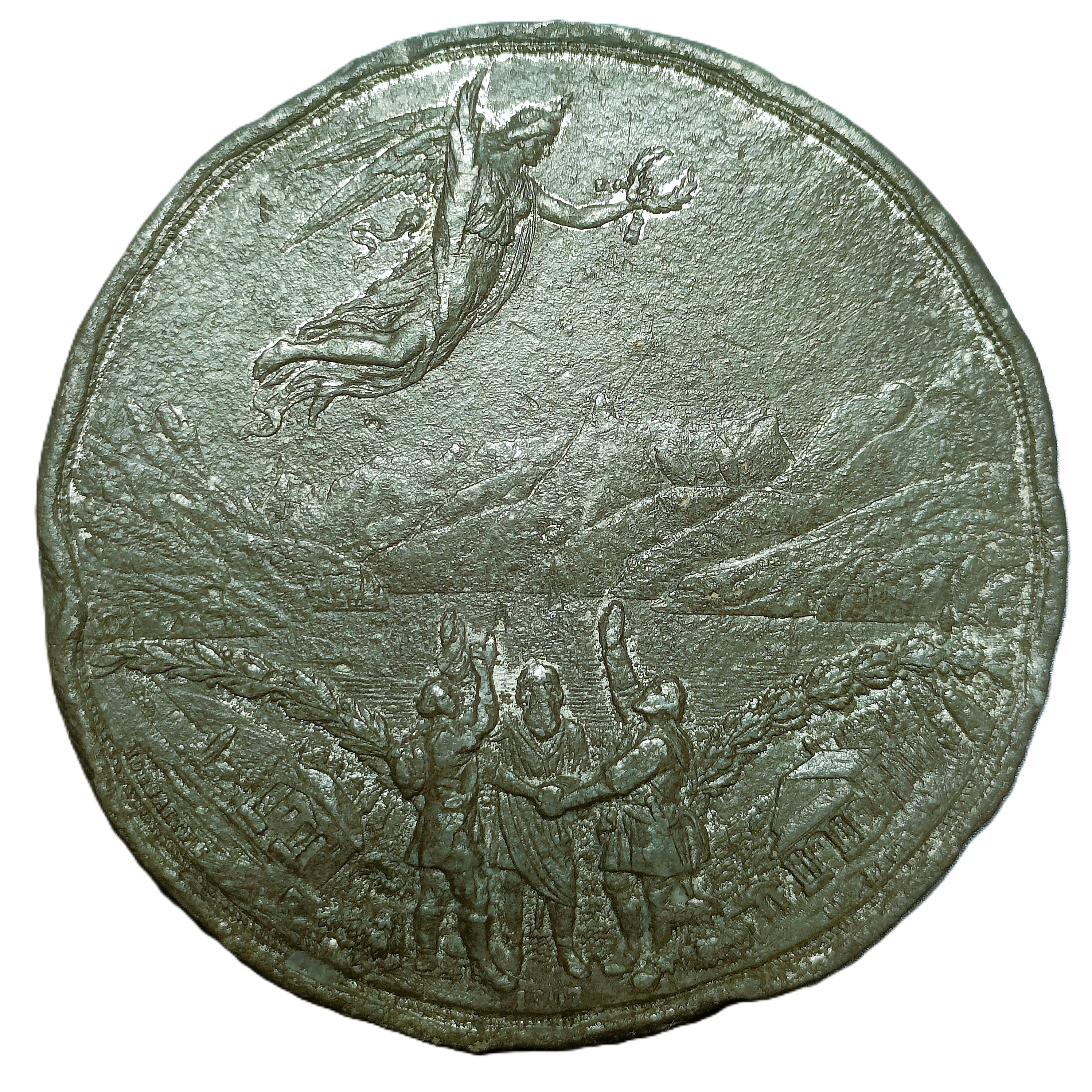 Опис: Сцена з Рютліської присяги 1307 року з видом на Моргартен і Земпах: три фігури стоять обличчям до обличчя, тримаючись за руки; зверху — Перемога, що летить праворуч, тримаючи корону, лаврові та дубові гілки ліворуч і праворуч, на задньому плані — села та озера.
