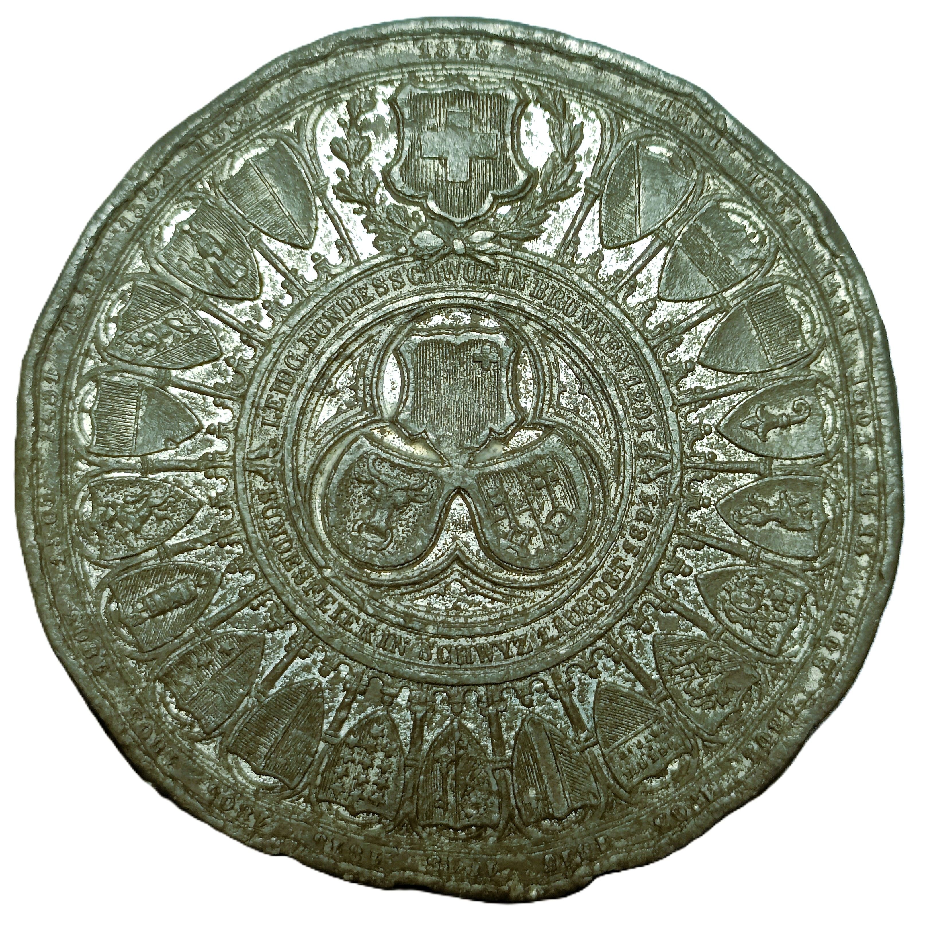 Опис: Герб трьох оригінальних кантонів (Урі, Швіц та Унтервальден), оточений гербом Швейцарії та гербами 19 інших кантонів з різними датами.