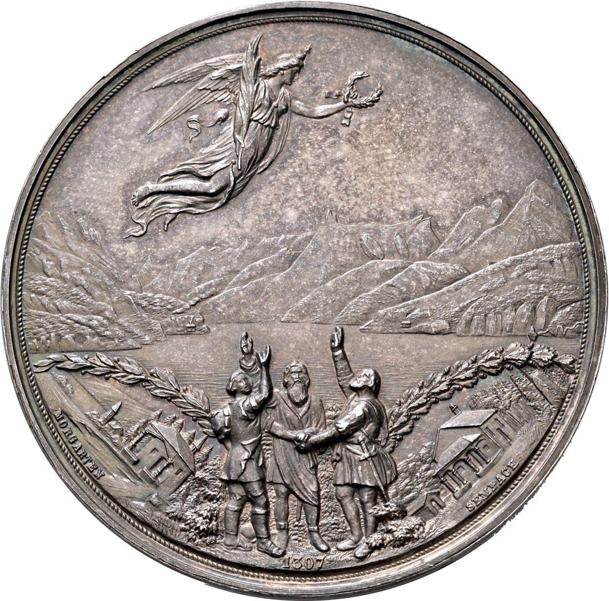 Опис: Клятва Рютлі: три фігури, що стоять одна навпроти одної, тримаючись за руки; зверху — Перемога, що летить праворуч, тримаючи вінок, лаврову гілку та дубову гілку ліворуч і праворуч, на тлі — села та озера.