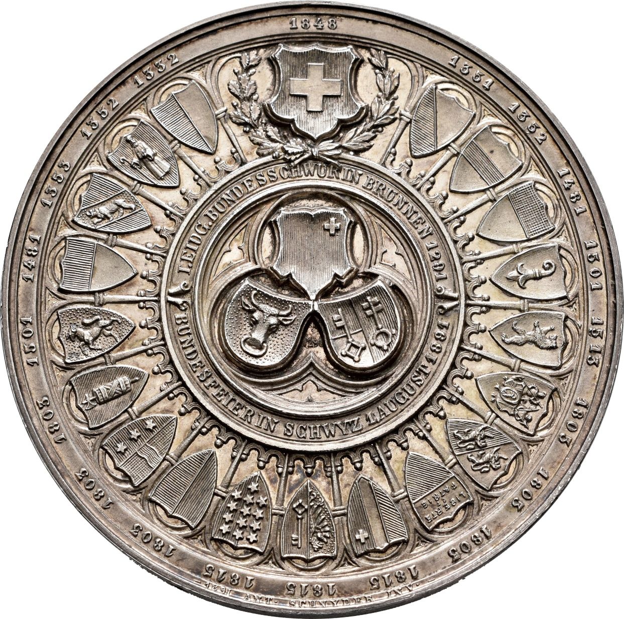 Опис: Герби Урі, Швіца та Унтервальдена в трилобі; все в межах кордону гербів в арках і датах.