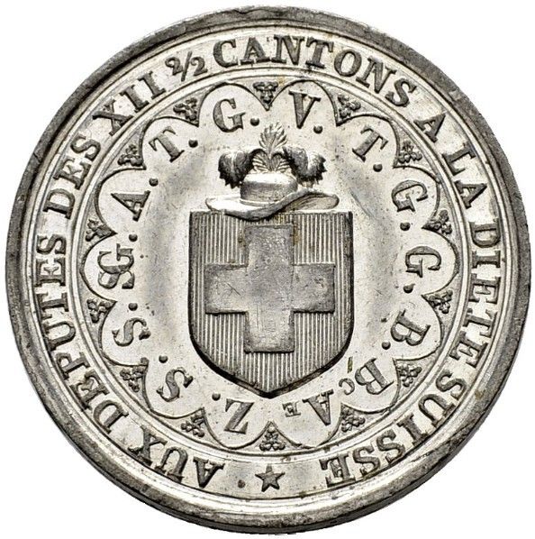 Опис: Швейцарський герб на щиті, над яким зображено капелюх з пір'ям. Навколо герба, в квітковій рамці, розміщені ініціали швейцарських кантонів. Напис на зовнішньому краю.