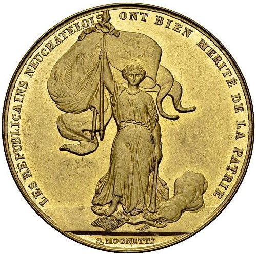 Опис: Жіноча алегорія, що уособлює кантон Невшатель, одягнена в античному стилі, ставить праву ногу на зламане ярмо. У піднятій правій руці тримає два жезли, зліва — швейцарський прапор, а праворуч — прапор Невшателя. У лівій руці тримає запалений факел, спрямований до землі, дим розсіюється на задньому плані.