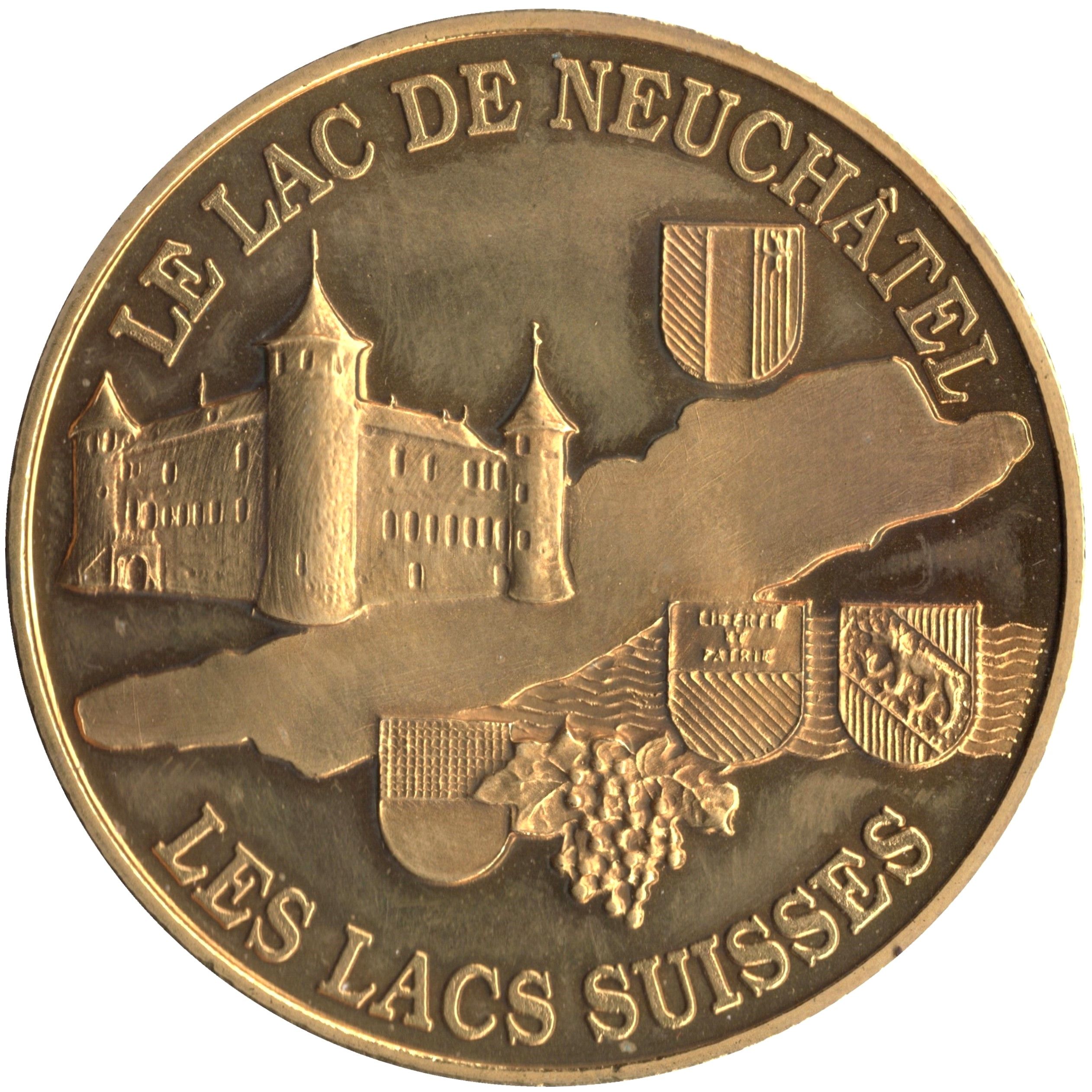 Опис: Карта озера, замок Невшатель, гроно винограду та герби кантонів, що межують з озером (Фрібур, Невшатель, Во та Берн).