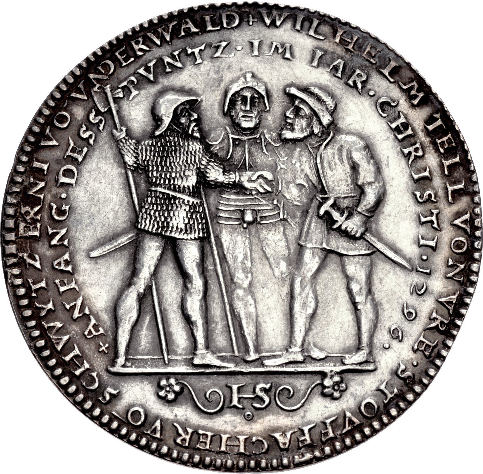 Опис: Вільгельм Телль з Урі, Вернер Штауффахер зі Швіца та Арнольд з Мельхталя з Унтервальдена складають присягу на Рютлі.
