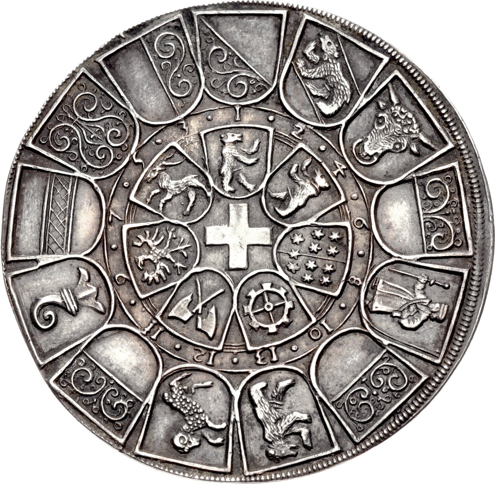 Опис: 13 гербів на квадратних щитах у зовнішньому колі, за годинниковою стрілкою: Цюрих, Берн, Урі, Унтервальден, Гларус, Фрібур, Аппенцелль, Шаффхаузен, Золотурн, Базель, Цуг, Швіц і Люцерн. Сім гербів на квадратних щитах у внутрішньому колі. За годинниковою стрілкою: Імперське абатство Санкт-Галлен, Імперське місто Санкт-Галлен, Республіка Семи Десятин, Імперське місто Мюлуз, Біл, Імперське місто Ротвайль та Три Ліги. Швейцарський хрест у центрі.