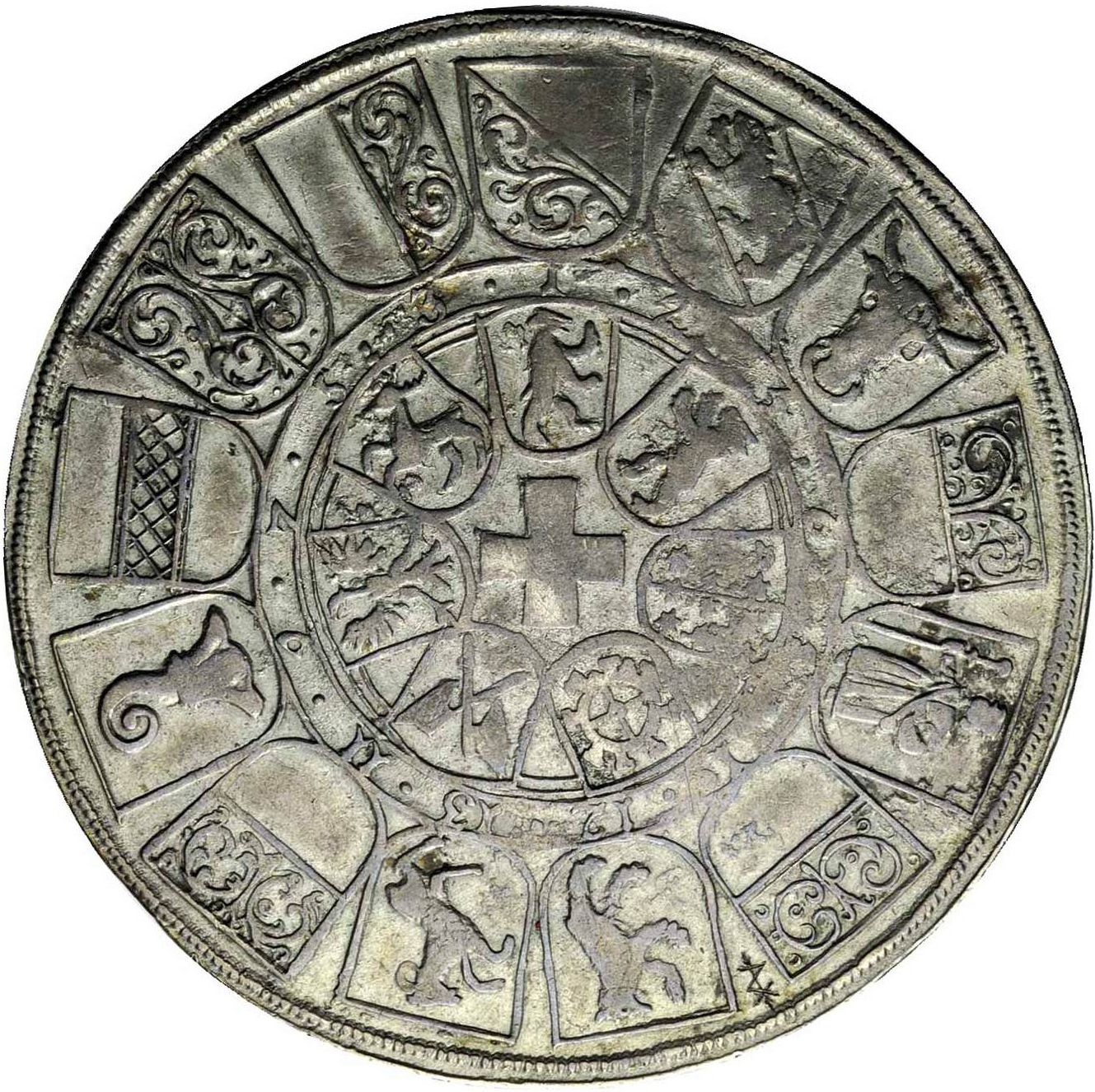 Опис: 13 гербів на квадратних щитах у зовнішньому колі, за годинниковою стрілкою: Цюрих, Берн, Урі, Унтервальден, Гларус, Фрібур, Аппенцелль, Шаффхаузен, Золотурн, Базель, Цуг, Швіц та Люцерн. Сім гербів на квадратних щитах у внутрішньому колі. За годинниковою стрілкою: Імперське абатство Санкт-Галлен, Імперське місто Санкт-Галлен, Республіка Семи Десятин, Імперське місто Мюлуз, Біль, Імперське місто Ротвайль та Три Ліги. Швейцарський хрест у центрі.