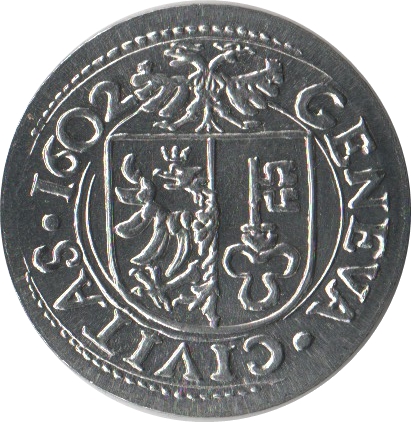 Опис: Репродукція аверсу женевської монети 1602 року з гербом, увінчаним двоголовим орлом