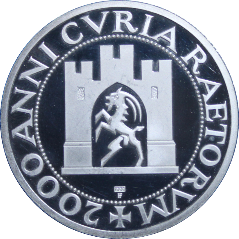 Опис: Герб кантону Граубюнден, оточений латинським написом. Клеймо проби срібла.