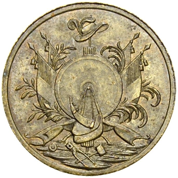 Опис: У центрі — сумка та порохівниця, що висять на мішені. Позаду — чотири прапори, руків’я рушниць, лікторські палиці, лаврове гілля ліворуч і пальмове гілля праворуч. Молоток і щипці знизу. Капелюх з пір’ям зверху.