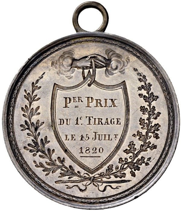 Опис: Написи у чотирьох рядках у щиті, який тримають руки, що стискаються. Вінок, утворений гілкою лавра зліва та дуба справа.