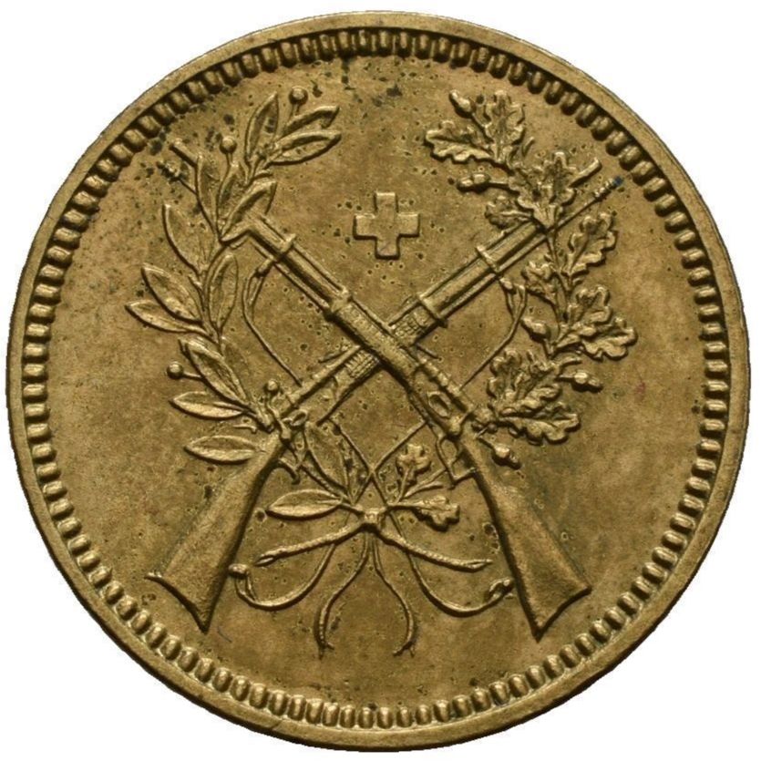 Опис: Дві перехрещені гвинтівки в центрі. Гілка дуба праворуч і гілка лавра ліворуч, пов'язані стрічкою. Швейцарський хрест зверху.