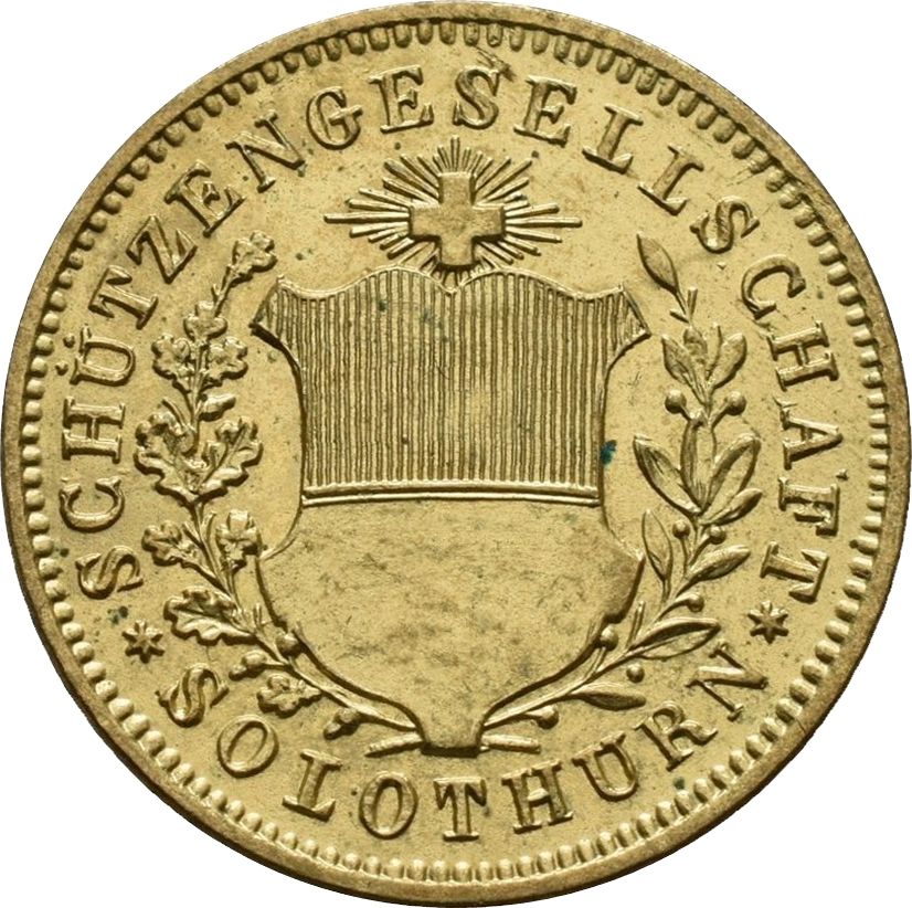 Опис: У центрі — герб Золотурна. Зверху — променистий швейцарський хрест. Зліва — гілка дуба, праворуч — гілка лавра.