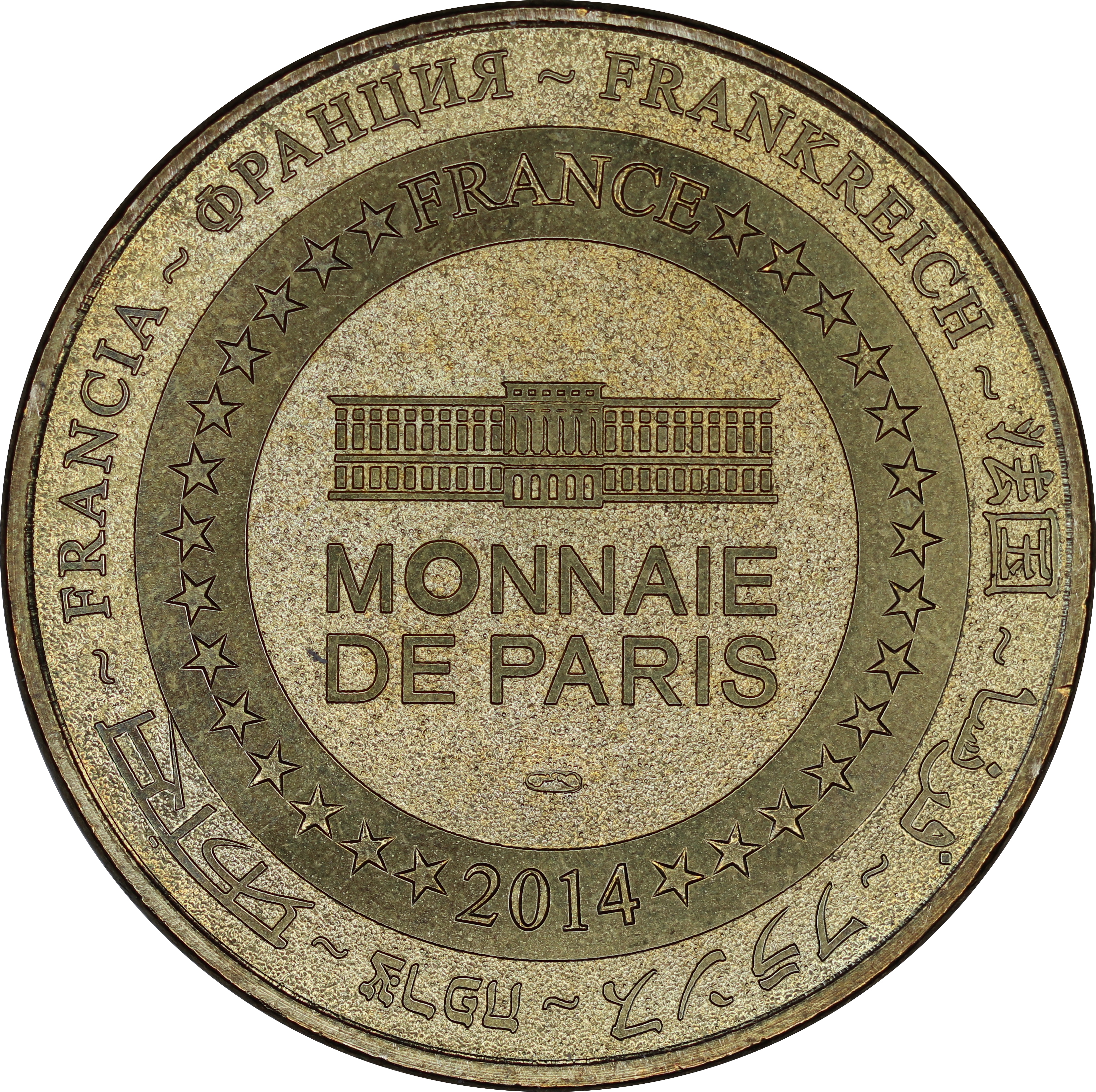 Опис: На периферії слово «Франція» написано вісьмома мовами. Франція на 12-й годині, 2014 рік на 6-й годині, все пов'язане 14 зірками праворуч і ліворуч. У центрі — будівля Моне де Парі.