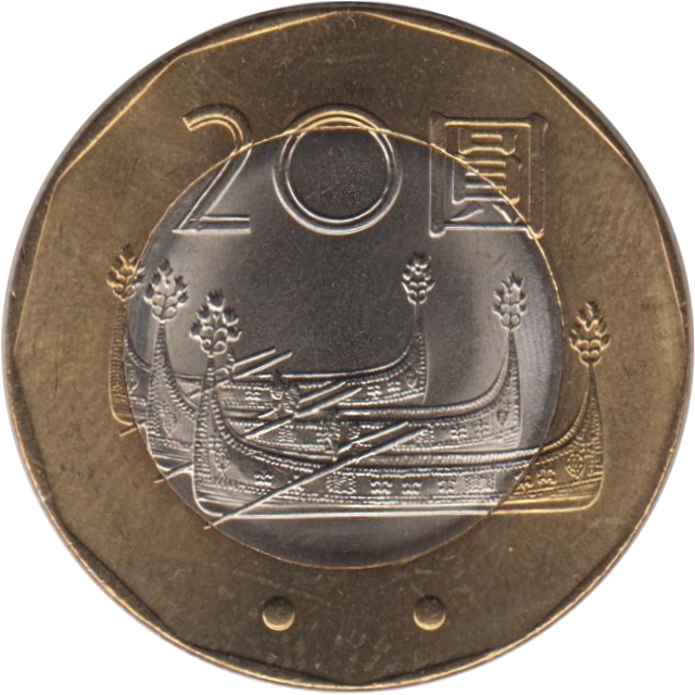 Метал: Біметалева: мідно-нікелевий центр в алюмінієво-бронзовому кільці (зовнішнє кільце: 92 % міді, 6 % алюмінію, 2 % нікелю; внутрішнє коло: 75 % міді, 25 % нікелю)