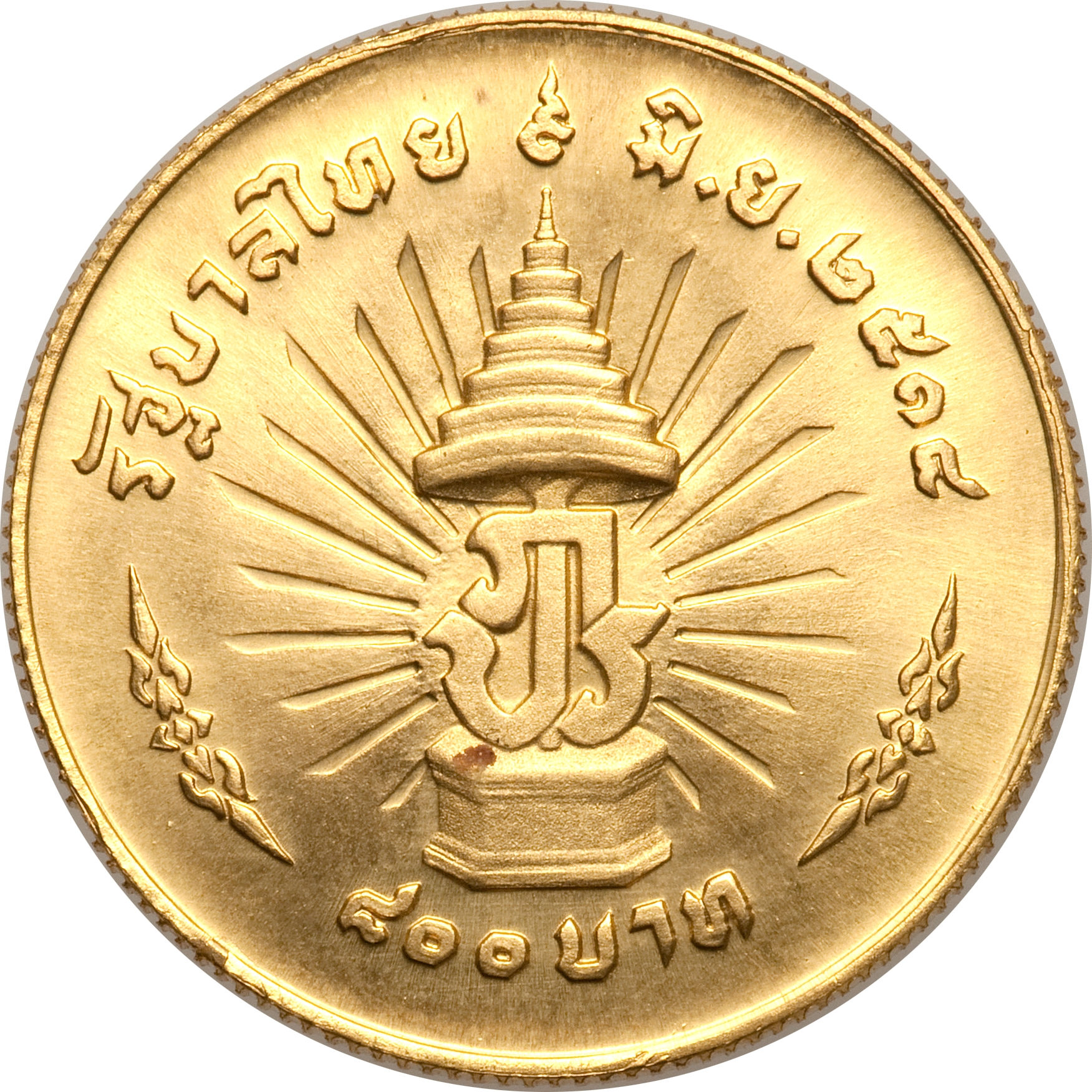 Опис: Монограма короля Рама IX на восьмикутному троні «Attathit U-thumphon Ratcha At» під семирівневими парасольками Chhatra, що випромінюють 22 промені.
