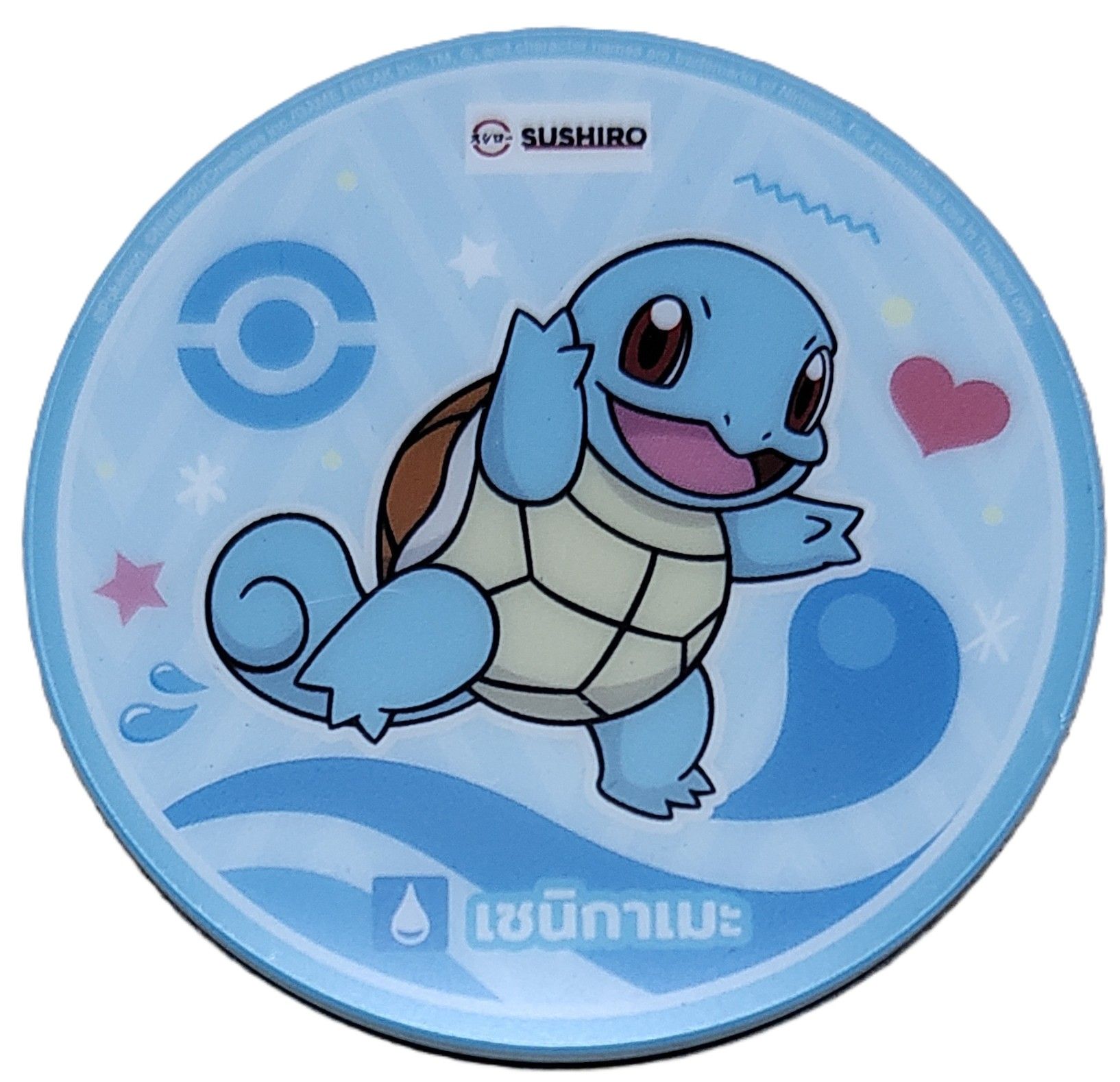 Опис: Повна фігура Сквіртла, що йде вліво, посміхається, оточена рожевим серцем, рожевими п'ятикутними зірками, білими шестикутними сніжинками та синім мотивом Покеболів. Символ та назва типу «Вода» внизу. Логотип Sushiro вгорі. Світло-блакитний фон.