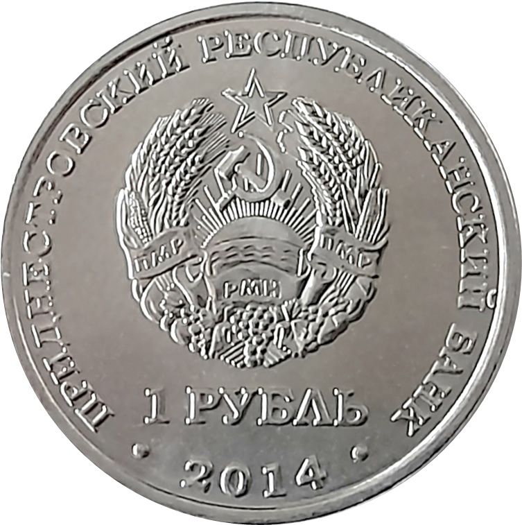 Опис: У центрі — державний герб Придністровської Молдавської Республіки; по краю — напис: у верхній частині — «ПРИДНЕСТРОВСКИЙ РЕСПУБЛИКАНСКИЙ БАНК» (Придністровський республіканський банк), внизу - рік випуску «2014»; внизу під гербом - номінал «1 РУБЛЬ» (1 рубль).