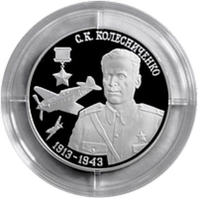 Опис: Портрет Героя Радянського Союзу С.К. Колесніченка в гімнастичному костюмі; ліворуч — зображення медалі «Золота Зірка» та двох літаків.