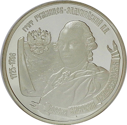 Опис: Зображення портрета графа П.А. Румянцева-Задунайського крупним планом знаходиться праворуч на передньому плані, зображення карти Придністровського регіону — ліворуч на задньому плані, зображення герба Російської імперії — над зображенням карти. По краю монети розміщено напис «граф РУМЯНЦЕВ-ЗАДУНАЙСКИЙ П.А.» (граф П.А. Румянцев-Задунайський) російською мовою. У нижній частині по краю зображено круговий напис російською мовою «РОССИЯ В ИСТОРИИ ПРИДНЕСТРОВЬЯ» (Росія в історії Придністров'я) на стилізованій стрічці. Навколо портрета зліва вздовж краю розміщено напис «1725 - 1796», що вказує на роки життя Рум'янцева-Задунайського.