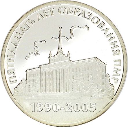 Опис: У центрі зображено Будинок Рад, на колі над ним напис: «ПЯТНАДЦАТЬ ЛЕТ ОБРАЗОВАНИЯ ПМР» (П'ЯТНАДЦЯТЬ РОКІВ ФОРМУВАННЯ ПМР), нижче — «1990-2005».