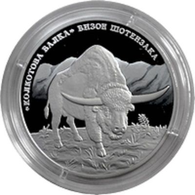 Опис: У центрі зображено стилізоване зображення бізона на тлі пагорбів.
