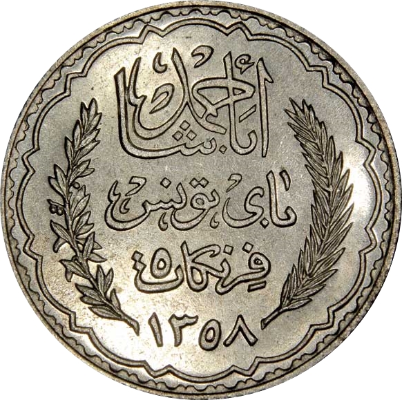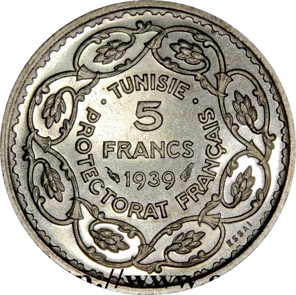 5 франків — Ахмад II (Essai) 1939 – 1939 Туніс