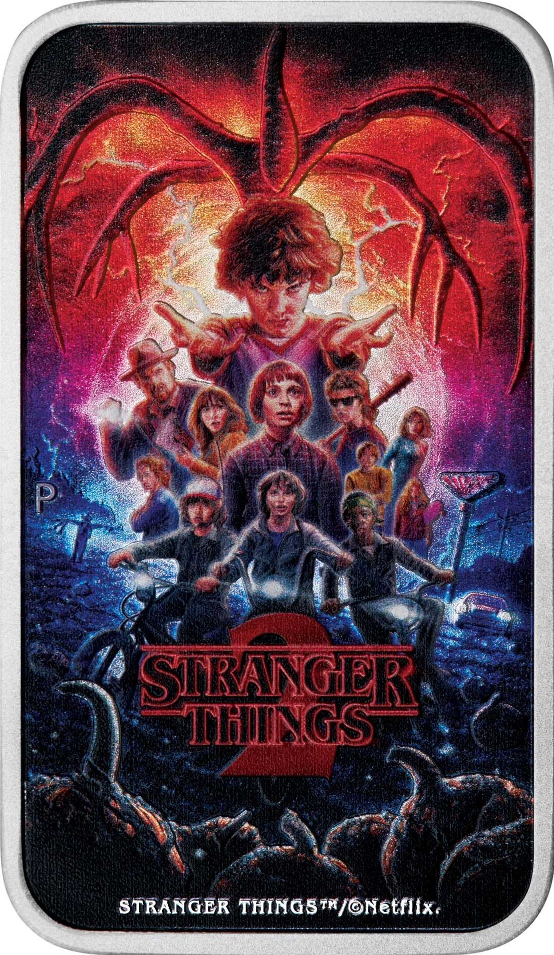 Опис: Культовий постер 2 сезону з головними героями, на якому основна увага приділена Одинадцятій у драматичний момент, коли вона вивільняє свої надприродні сили. На тлі зображено моторошний світ «Упсайд Даун» із силуетом Майнд-Флейєра, що домінує над бурхливим небом, та примарним полем гарбузів внизу.