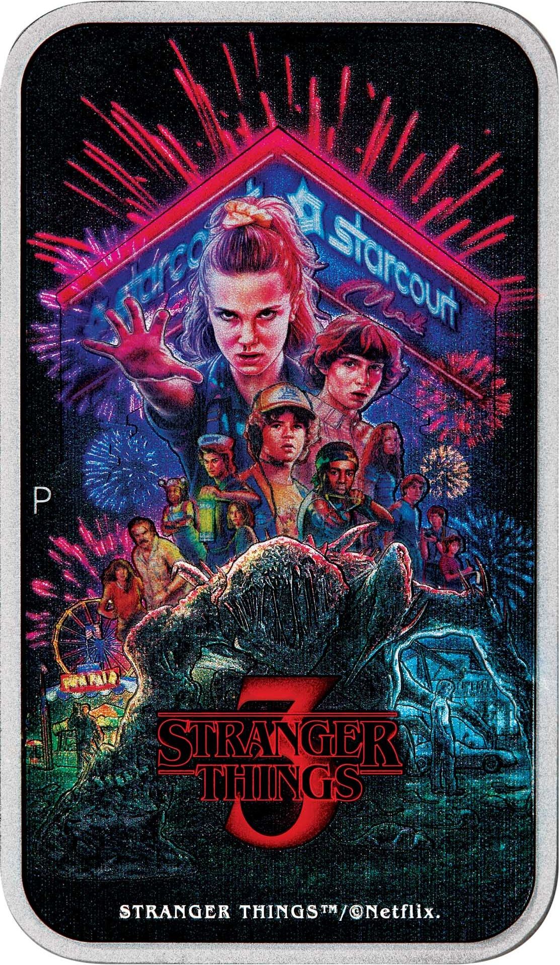 Опис: Культовий постер 3 сезону. На постері зображені головні герої — Майк, Дастін, Лукас, Одинадцять та решта команди з Гокінса — об’єднані в драматичній сцені, освітленій вибухаючими феєрверками, атракціонами та сяючим вивіскою торгового центру «Старкорт». На передньому плані видніється загрозлива постать Майнд-Флейєра.