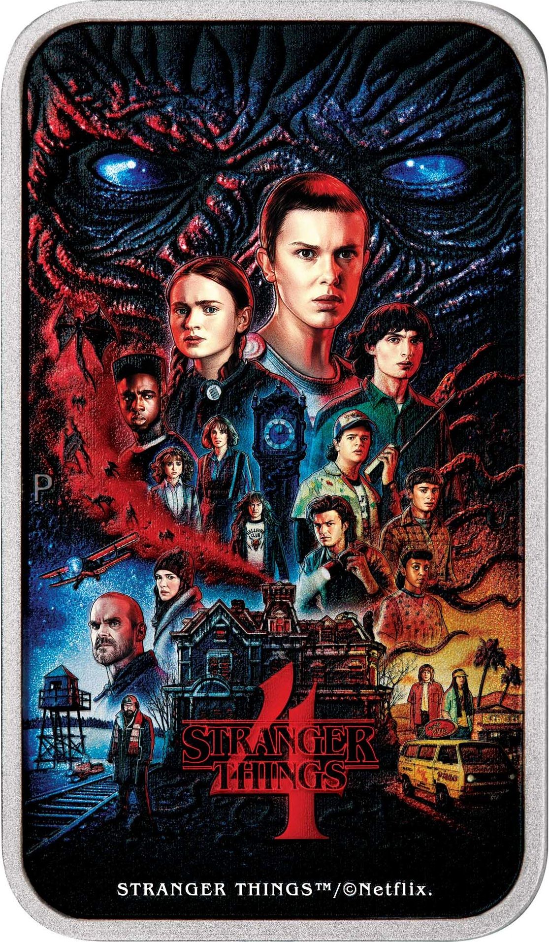 Опис: Культовий постер 4 сезону. Дизайн показує головних героїв — Одинадцяту, Майка, Дастіна, Лукаса, Макс і Вілла — разом з рештою команди з Гокінса, а все це обрамлено моторошним розривом між реальним світом та «Перевернутим світом». До зловісної атмосфери додаються пронизливий погляд Векни, примарний силует будинку Кріл та рой демобатів, що прорізають червоний дим.