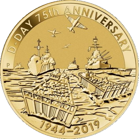 Опис: На реверсі монети зображено союзні війська, яких великі військові кораблі перевозять до узбережжя Франції, де солдати висадилися в узгоджених місцях уздовж 80-кілометрової ділянки пляжу. Флот супроводжують бомбардувальники в небі. Також на монеті є напис «D-DAY 75th ANNIVERSARY 1944-2019» (75-та річниця Дня Д 1944-2019) та знак монетного двору Перта «P».