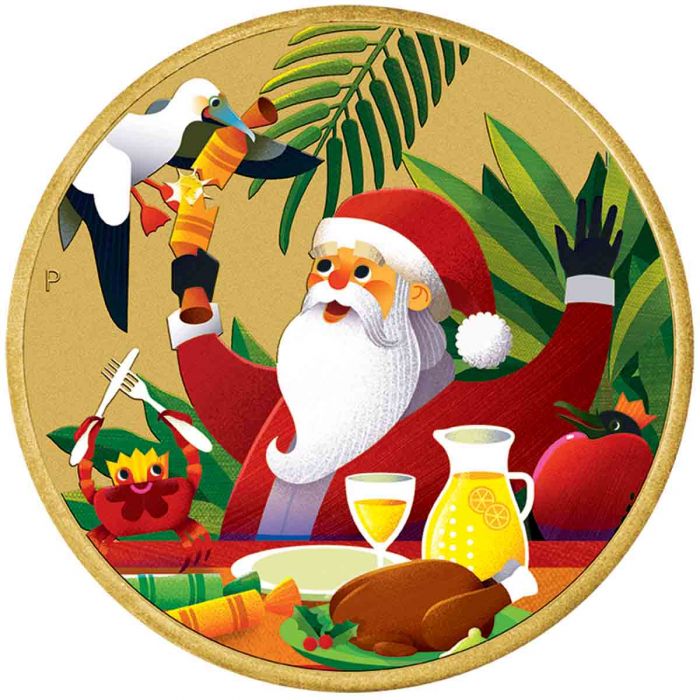 Опис: На реверсі монети зображений Санта-Клаус із тваринами, поширеними на зовнішній території Австралії, включаючи морського птаха, чорного фрегата та червоного краба серед австралійської рослинності. Дизайн також включає традиційну марку монетного двору Перта «P».