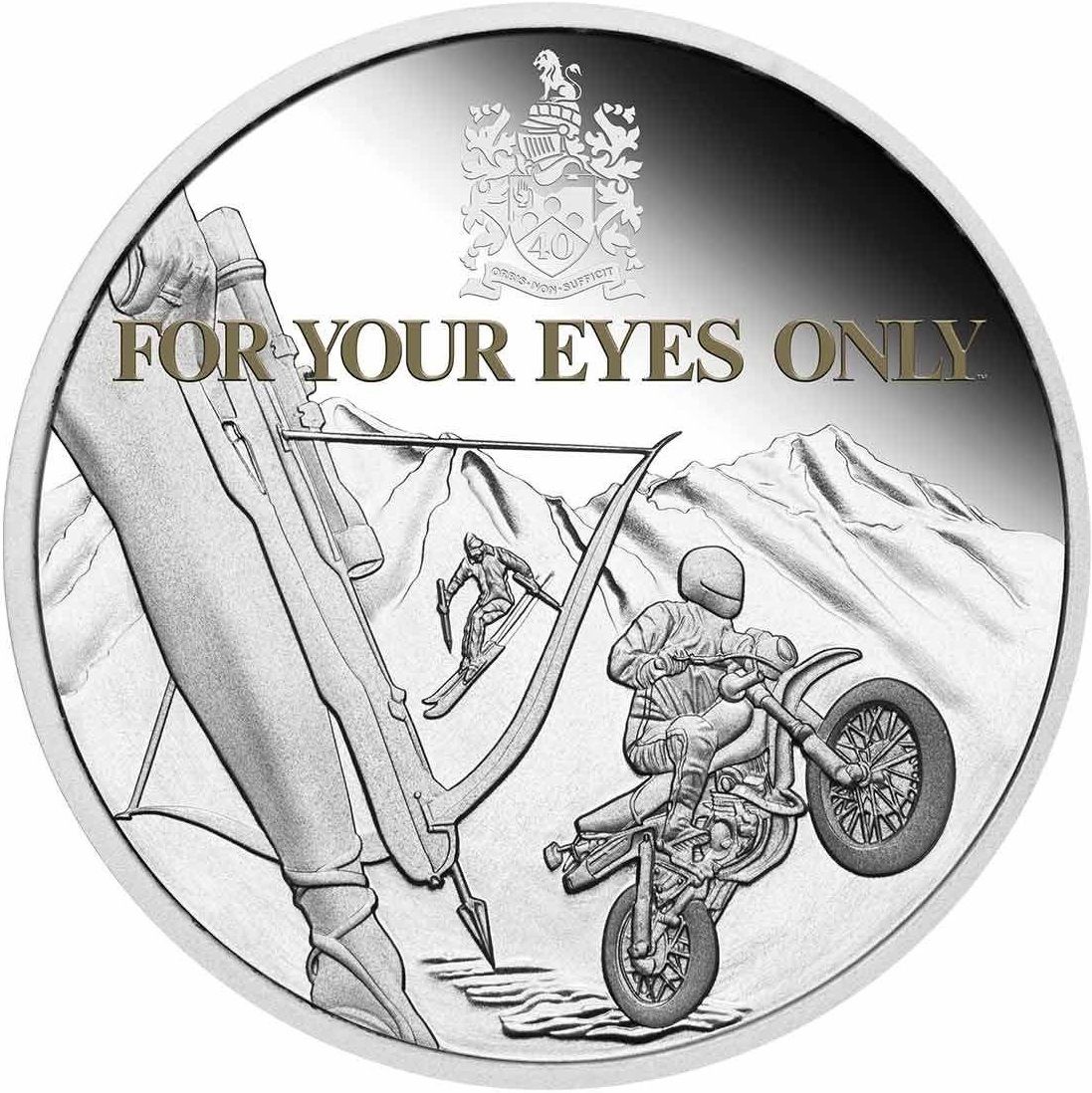 Опис: Мотоцикліст-вбивця та фрагмент зображення жіночої ноги і арбалета, натхненні оригінальним постером фільму. Джеймс Бонд, що спускається на лижах, та герб родини Бондів.
