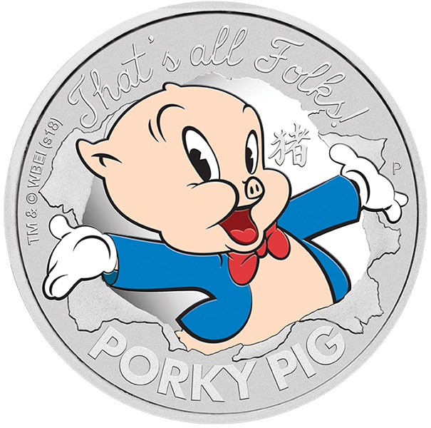 Опис: PORKY PIG у кольорі з розпростертими руками під знаковим написом Looney Tunes «That’s all Folks!». У дизайні також присутні слова PORKY PIG та ієрогліф «свиня» в транскрипції піньїнь.