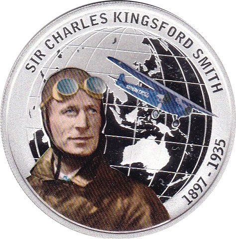 Опис: Кольоровий портрет сера Чарльза Кінгсфорда Сміта, з кольоровим літаком і картою Австралазії на тлі.