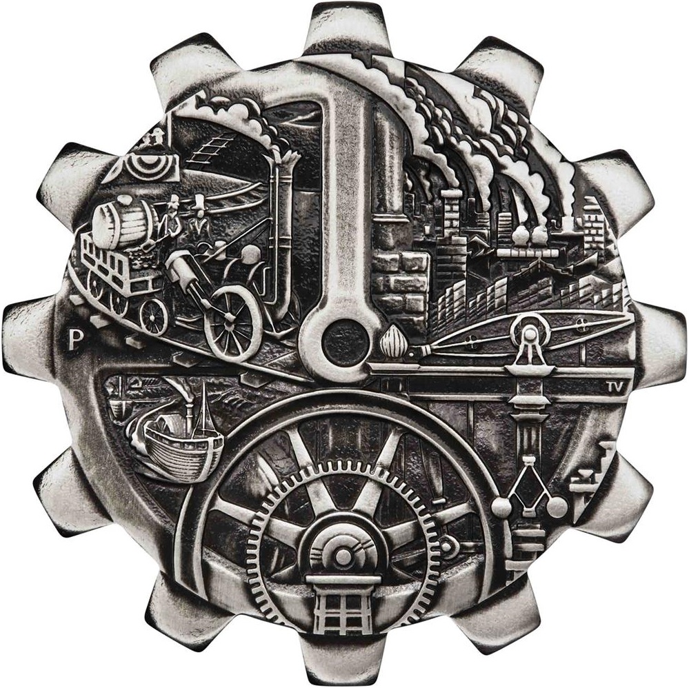 Опис: Ранній паровоз; димарі млинів, які використовували парову енергію для приводу великогабаритного обладнання; та піонерський пароплав. У дизайні використано велике махове колесо та інші компоненти, що символізують елементи революційного парового двигуна Боултона і Ватта.