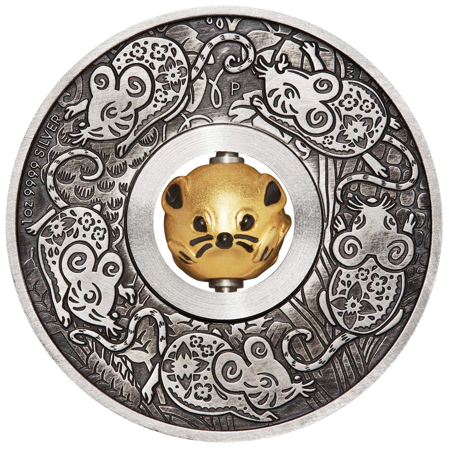 Опис: Стилізовані миші та зображення пшениці, винограду та кукурудзи — символи врожайного врожаю, який у китайській культурі асоціюється зі щастям та достатком. У центрі монети розміщено обертову вставку у формі миші. Виготовлена зі срібла 925 проби, покрита 18-каратним золотом.