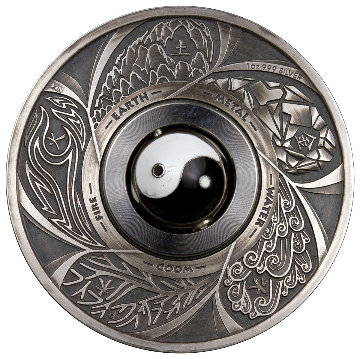 Опис: Містить китайські елементи дерева, вогню, землі, металу та води, а також обертовий талісман Інь-Янь у центрі.