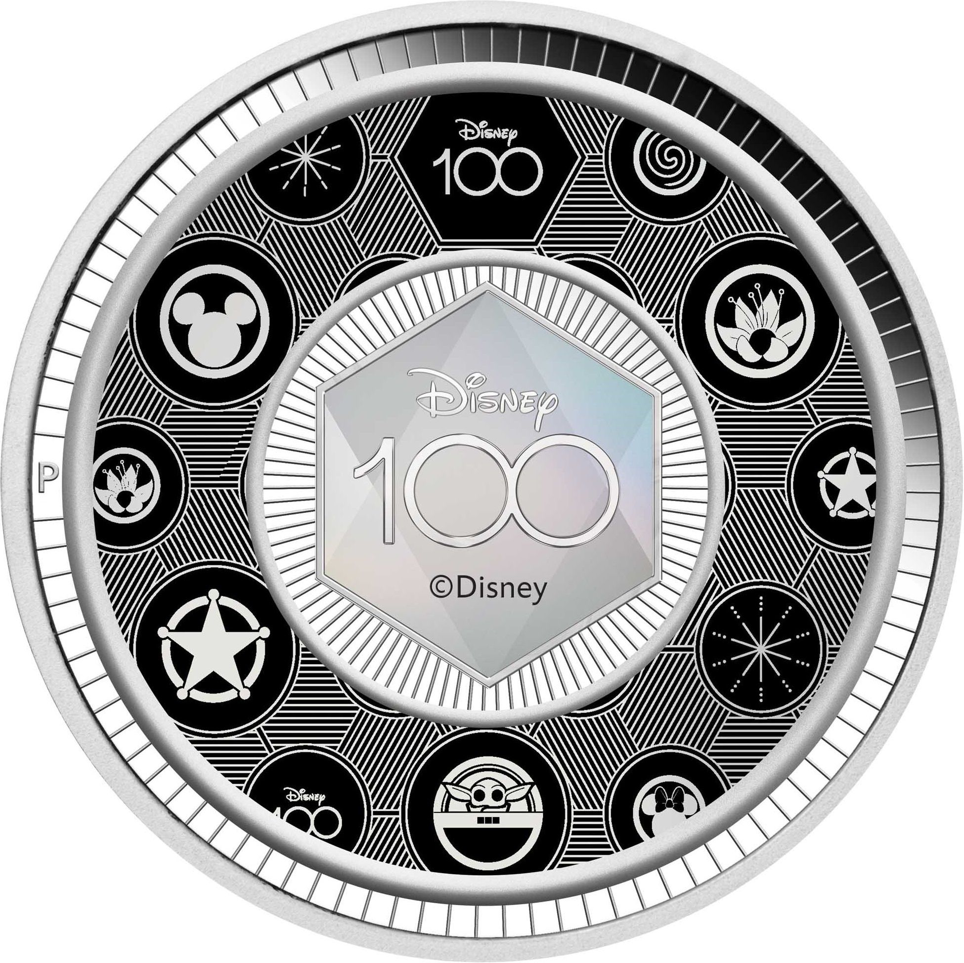 Опис: Логотип «Disney 100» оточений круглими іконками, що символізують основні кінофільми та франшизи, створені Disney, включаючи Міккі Мауса, Історію іграшок та Зоряні війни.