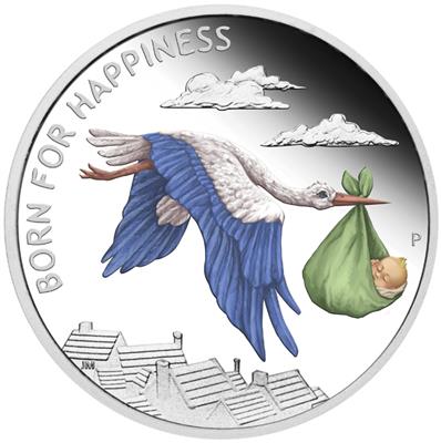 Опис: У західному фольклорі батьки століттями розповідали своїм дітям, що дітей приносить лелека. На реверсі монети зображено лелеку, що летить високо над дахами будинків, несучи спляче немовля, загорнуте в пелюшку.